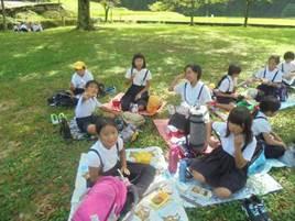 昼食のお弁当を広い芝生の上で食べた後は、環境学習をしました。水についての学習で、パックテストも行い、家庭から出る排水で最も川を汚すものを調べました。何が一番川を汚すのかは子どもたちに正解を聞いてください。