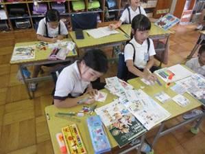 今週、2年生が図工で「つづき絵どんどん」の学習をしていました。小さい紙に続きのお話を絵で表現し、のりでつなげていました。相変わらず図工大好きの2年生。集中してカメラにも気付かないようでした。また、昨日は、体育で「はばとび、ゴムとびあそび」をしていました。いろんな動きにチャレンジしながら幅跳びやゴム跳びの基礎的な動きを体験し、汗びっしょりになっていました。