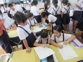 昨日の2~3時間目に、2年生が生活科で町たんけんに行きました。人数が多い2年生は「セブンイレブン・郵便局」グループと「よかよかとれたて市場」の2つのコースに別れて探検しました。学校からも近く、行ったことがあるという子どもも多かったかもしれませんが、じっくり見学したり質問したりして新しい発見があったのではないでしょうか?シートに入りきらないほどたくさんメモした子どももいたようです。ご協力いただいた関係者のみなさま、ありがとうございました!
