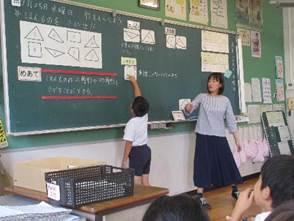 嘉島町では各小学校や中学校の先生方で「英語教育推進プロジェクトチーム」が作られ、町内の英語教育に力を入れています。その取組の一つとして、英語教育乗り入れ授業があります。これは、中学校の英語担当の先生が小学校の外国語活動の授業にT2として入られるものです。先週の金曜日に、中学校の福島先生が、6年生の授業に入られ一緒に外国語の学習をしました。英語で先生が自己紹介されましたが、聞いたことがある単語などを手掛かりに、しっかり聞きとっていました。その後、ゲームをしてそれぞれの夏の思い出を英語で伝えあう学習をしました。授業を終えた福島先生から、よく言えていましたと誉めていただきました。