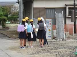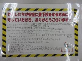 学校の前で災害公営住宅建設のための工事が昨年から行われていますが、安全のために交通誘導員の方が配置されていました。子どもたちの登下校時には、安全を守るだけでなく、声をかけてくださったり、子どもたちが通行しない時間帯には、校門の前を掃除してくださったりと学校にもずいぶん貢献していただきました。その方が、5月いっぱいで任務が終了するというお話を聞き、5年生と6年生が代表でお礼の寄せ書きを書いてお渡ししました。今まで子どもたちの安全を見守っていただきありがとうございました!