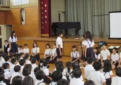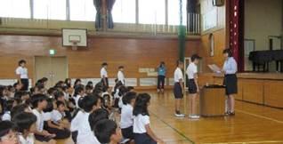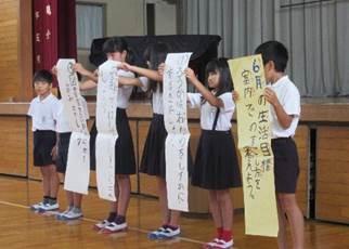 昨日の児童集会で、6年生の発表がありました。学級目標を劇にして発表し、リコーダーの演奏を発表してくれました。最上級生らしい目標に向けて日々がんばっている6年生です。下級生の手本となれるよう今後もがんばってほしいものです。また、リコーダーの演奏には、下級生から「きれいな音でした。」という感想をもらっていました。そのあと、生活安全委員会の発表があり、雨の日のくらし方についてみんなで確認しました。これから雨の日が増えると思いますので、安全な生活をしていきましょう。