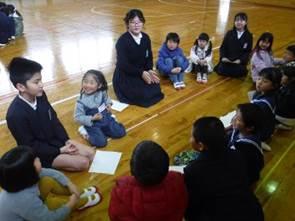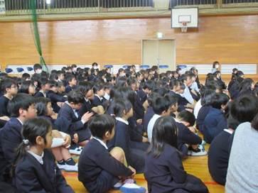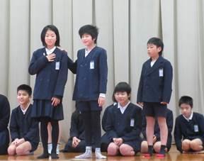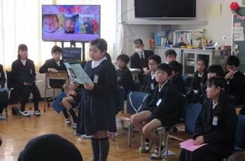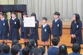 昨日、児童集会がありました。今回は、5年生の発表でした。英語で会話をした5年生から「どんな意味かわかりますか?」と問いかけられますが、ちょっとレベルの高い会話にいつも元気な低学年の手も挙がりませんでした。しかし、答えは「あとで5年生に聞いてください。」という予想を裏切るものでした。その後、運営委員会から、1月に行った書き損じはがき回収の結果のお知らせがありました。なんと、452枚ものはがきが集まったそうです。ご協力ありがとうございました。