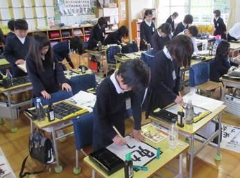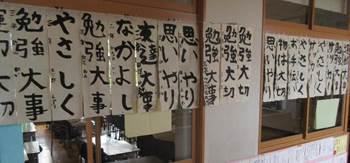 3年生が習字の学習をしていました。習字は3年生から新しく始まる学習です。1学期には、道具の置き方や筆の持ち方を学習していた子どもたちですが、今ではすっかり身についてきており、昨日は普通の紙ではなく、長い紙に自分の目標を書いていました。長い紙に書くため、松本先生の指導のもと、立ったままの姿勢で書いていました。2時間かけて清書し、完成した作品は廊下にずらりと並んでいました。