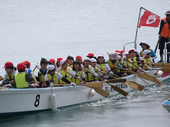 一隻のペーロン船を、力を合わせて漕ぎました。みんなで声を出し、
