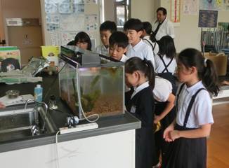 さっそく理科室に設置したところ、たくさんの子どもたちがメダカを見に集まってきました。