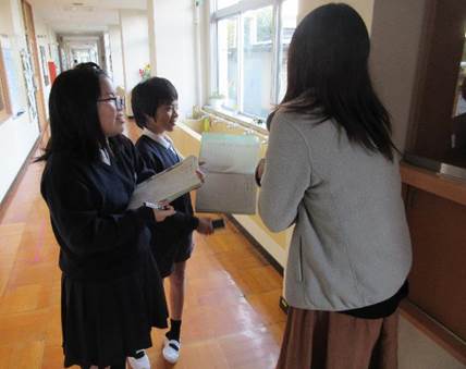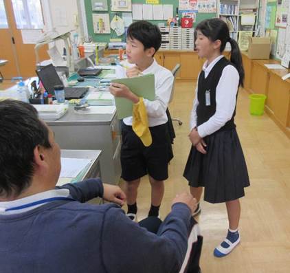 5年生が外国語活動の授業で「She can run fast.He can jump high.」の学習をしています。学習のまとめとして、先生方に「Can you ~?」とインタビューをして、先生方のできることを紹介する活動をします。休み時間に、ペアになった5年生が先生方にインタビューをしました。緊張しながらも、しっかりインタビューをがんばっていましたよ。