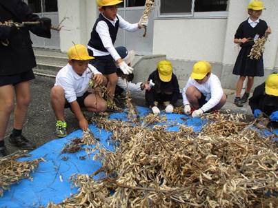 地域の藤瀨さんのご協力で、大豆の収穫体験をさせていただきました。初めて体験する子がほとんどで、大喜びでの収穫となりました。収穫した大豆は、根をとって乾燥させました。3学期に、大豆パーティーをする計画です。