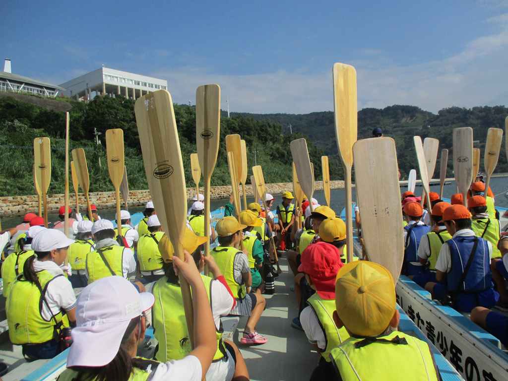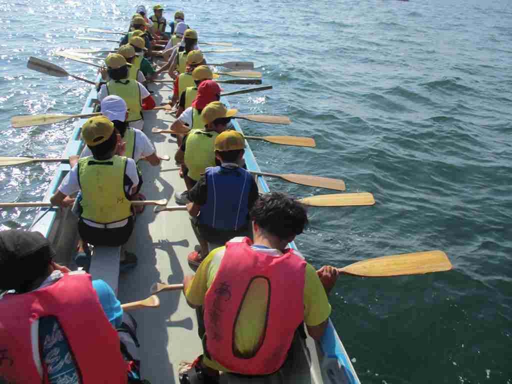 午後からは、マリン活動「ペーロン艇」を行いました。5年生20名で力を合わせてペーロン艇をこぎました。初めは、息が合わずあまりスピードも出ませんでしたが、後半はみんなで声を出し、力を合わせてこぐことができました。この活動を通して、子どもたちは協力することの大切さを学ぶことができました。