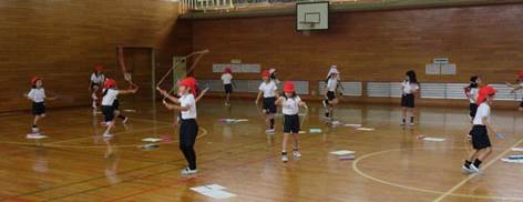 1年生の体育の授業で、なわとびとマットの学習が行われていました。今日は、かけ足とびを練習していたようです。体育館で汗びっしょりになって練習を頑張っていました。最後は、誰が最後まで跳び続けることができるかの挑戦です。引っかかった子どもたちは座ります。跳んでいる子どもの数がだんだん少なくなりプレッシャーがかかります。でも、座っている子どもたちがしっかり応援してほほえましい光景でした。今回は、男の子がチャンピオンでした。その後、マットで前まわりをしました。なわとびも前まわりもとても上手な1年生でした。