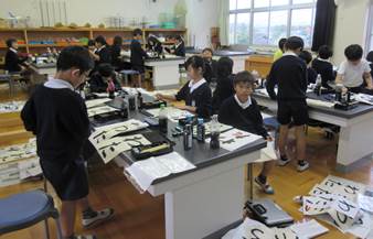 理科室で習字(4年生)