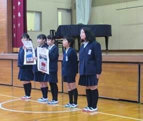 今朝は厳しい寒さでしたが、子どもたちは元気に登校し、児童集会が行われました。最初に1年1組の発表がありました。1年間で成長したことを、劇にして発表し、みんなで振り付きの「おもちゃのチャチャチャ」を歌ってくれました。本当にいろんなことができるようになったんだなぁと実感し、1年生の成長を感じました。次に、1月に行われた「熊本県人権子ども集会」に参加した子どもたちからの報告が行われました。今年は会場の都合で少ない人での参加でしたが、内容が盛りだくさんで、参加した子どもたちはたくさんのことを学んできたようでした。最後に環境給食委員会が作った廃油石けんの使い方をみんなに説明してくれました。