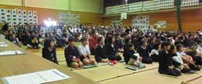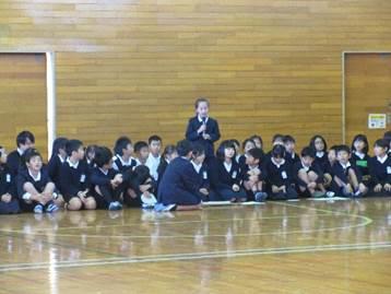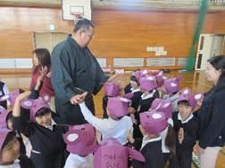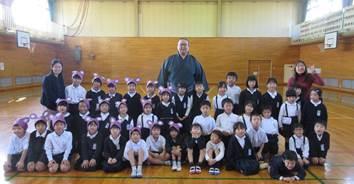 昨年に引き続き、九州場所を終えたばかりの本校(北甘木地区)出身の「芳東関(よしあずまぜき)」がサプライズで来校されました。東っ子発表会に向けて体育館で練習をしていた1年生のもとを訪れると、192㎝というその大きな体に歓声(悲鳴?)が響き渡りました。1年生からの質問攻めにも丁寧に答えてくださり、その後は手のひらの大きさ比べをして盛り上がりました。短い時間ではありましたが、地域出身でがんばっておられる先輩の姿に学んだ1年生でした。なお、大きくなるには「いっぱい食べること!」が大事だそうです。1年生、給食にも「全力で挑戦!」ですね。