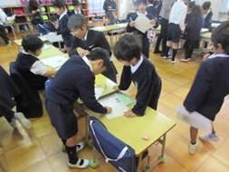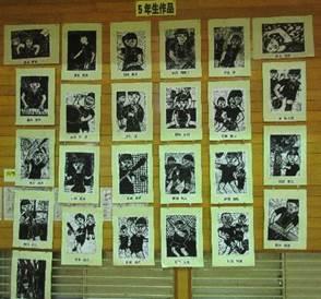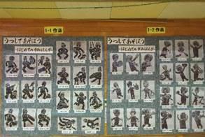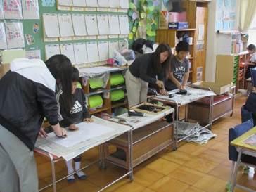 例年、この時期は東っ子発表会に向けての練習と同時進行で、郡版画展に向けての作品作りで大忙しの毎日です。各学年、郡版画展に向けて着々と作品づくりが進んでいるようです。今週には、1年1組で紙版画を刷っていました。担任の福永先生、支援員の福山先生に加え、学生ボランティアの学生さんもお手伝いに入っていただき作品が完成したようです。各学年の完成作品は、東っ子発表会のときに体育館に飾られる予定です。こうご期待!