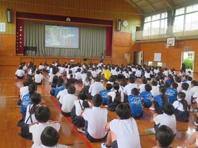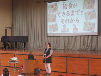 お話しいただくのは、嘉島中の栄養教諭・中山先生です。題は「給食ができるまでとそれから」。