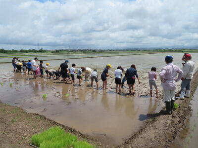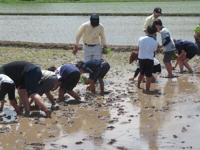 梅雨の晴れ間で気温が上がる中、地域の農家の方に教えてもらいながら、泥だらけになって頑張りました。