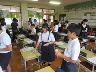嘉島町では各小学校や中学校の先生方で「英語教育推進プロジェクトチーム」が作られ、町内の英語教育に力を入れています。その取組の一つとして、英語教育乗り入れ授業があります。これは、中学校の英語担当の先生が小学校の外国語活動の授業にT2として入られるものです。先週の金曜日に、中学校の福島先生が、6年生の授業に入られ一緒に外国語の学習をしました。英語で先生が自己紹介されましたが、聞いたことがある単語などを手掛かりに、しっかり聞きとっていました。その後、ゲームをしてそれぞれの夏の思い出を英語で伝えあう学習をしました。授業を終えた福島先生から、よく言えていましたと誉めていただきました。