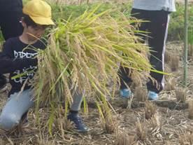 今週の月曜日に5年生が稲刈りを体験させていただきました。毎年地域の方のお世話になり、田植えや稲刈りの体験をさせていただいています。今年は雨のために延期となっていたのですが、やっと実現できて子どもたちも張り切っていました。はじめて鎌を使う子どももいて貴重な経験となりました。なかには「お米を作っている人たちがあせをかきながら、きついのにがんばって仕事をしているから、ぼくは次からご飯を残さないようにしようと思います。」という感想が見られ、食への感謝の気持ちも持つことができた子どももいました。ひとえにご協力くださったみなさんのおかげです。ありがとうございました!