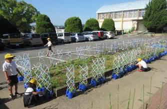 6月も終わろうとしているのに毎日晴れの日が続いています。子どもたちは、朝から登校すると自分が育てている植物に水をかけています。1年生の朝顔は、ずいぶん大きくなり花も咲きだしました。昨日やっと花が咲いた女の子は、「やったー!やっと咲いた!」と大喜びしていました。2年生のミニトマトもたくさん実がつき始めています。先週ぐらいからおうちに持って帰る姿も見られました。そのほかの学年も、理科で観察しているヒマワリやホウセンカなどに水をかけたり、観察したりしています。子どもたちの自然を大切にする心に元気をもらいながら1日がスタートします!