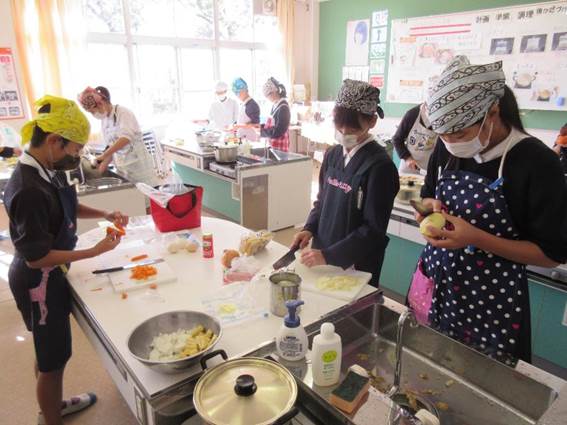 11月29日(木)に、6年生が調理実習を行いました。家庭科の「くふうしよう おいしい食事」の学習で、ごはんとみそ汁、そしておかず一品を作って試食を行いました。少々包丁の使い方が危なっかしい場面も見られましたが、校舎の中にはおいしいにおいが広がっていました。今回は、先生の手伝いなしで自分たちでしっかり作ることができました。ぜひおうちでもチャレンジ!