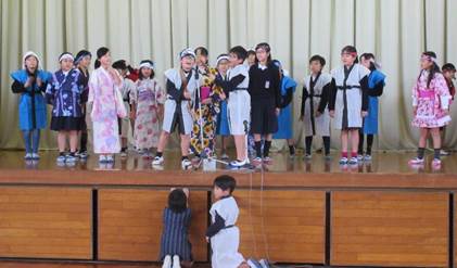 11月27日(火)の児童集会は、2年生の発表でした。外国語の学習で学んだボディタッチゲームを発表しました。「Please touch your ~.」と言って、肩やひざ、つまさきなど言われた体の部分をタッチするゲームです。手本を見せた2年生がみんなも一緒にやりましょうと呼びかけ、全員で楽しく歌に合わせて行いました。その後、運営委員会より日曜日に開催される東っ子発表会のスローガンが発表されました。今年のスローガンは「とどけよう東っ子の気持ち 平成最後だ全力で」です。このスローガンのもと、全学年日曜日に向けて練習をがんばっています。