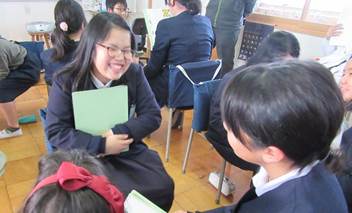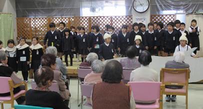 12月13日(木)に、1年生が康寿苑訪問を行いました。最初に、東っ子発表会で披露した「くじらぐも」の康寿苑バージョンを発表し、大きな拍手をいただきました。次に、おじいちゃんおばあちゃんと一緒に、ボール渡しゲームと風船渡しゲームをして盛り上がりました。最後に、おじいちゃんおばあちゃんに手作りのクリスマスカードを渡しました。1年生のかわいらしくも一生懸命の様子に「かわいいね。」「また来てね。」と、みなさん喜んで下さいました。