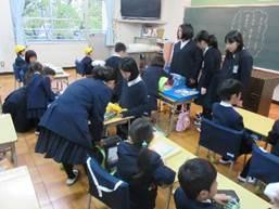 昨日、1年生と2年生で学校探検がおこなわれました。グループごとに2年生が1年生を案内しながら学校を全部まわりました。校長室では歴代の校長先生の写真を見たり、理科室でメダカに夢中になったりと楽しい探検だったようです。2年生も、お兄さん・お姉さんぶりを発揮して上手に案内していたようです。全部の部屋を覚えられたかな?