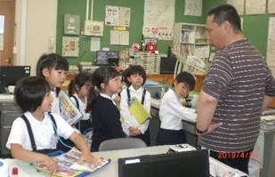 昨日、1年生と2年生で学校探検がおこなわれました。グループごとに2年生が1年生を案内しながら学校を全部まわりました。校長室では歴代の校長先生の写真を見たり、理科室でメダカに夢中になったりと楽しい探検だったようです。2年生も、お兄さん・お姉さんぶりを発揮して上手に案内していたようです。全部の部屋を覚えられたかな?