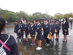 雨の中での平和集会でした。平和を誓い、折り鶴をささげました。