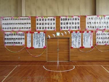 いよいよ明日は卒業式です。以前お知らせした通り、今年度は残念ながら来賓のみなさま及び在校生抜きの卒業式となります。寂しい会場を何とかしたいと先生方がアイデアを出し、運動会で使用した各学級ごとの子どもたちの顔写真を利用し、在校生が言うはずだった呼びかけと共に会場後方に掲示しました。卒業生は、呼びかけの時に保護者の方を向きますので、自然と在校生の顔も目に入ることになります。これで、出席はせずとも在校生に見守られながらの卒業式を行うことができます。子どもたちを思う先生方の姿も素晴らしい嘉島東小です!