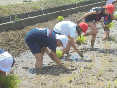 校区の農家の皆様の協力を得て、約1アールの田んぼに稲の苗を植え付けました。