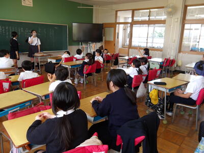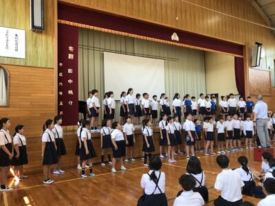 10月の全校集会では、郡音楽会に出場する5年生が合唱を披露しました。その後、人権担当の田中先生から「ひとつのことばで」という詩の紹介がありました。