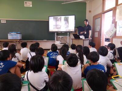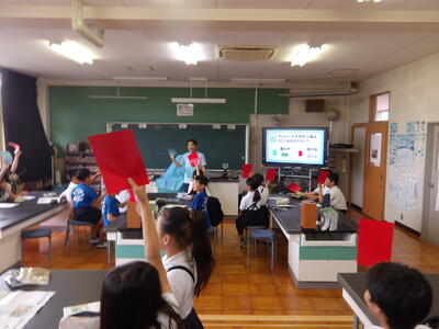 7月14日(月)に4年生対象に水育がありました。サントリーの方を講師に招いて、きれいな水を守るための取り組みについて学びました。