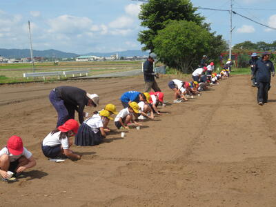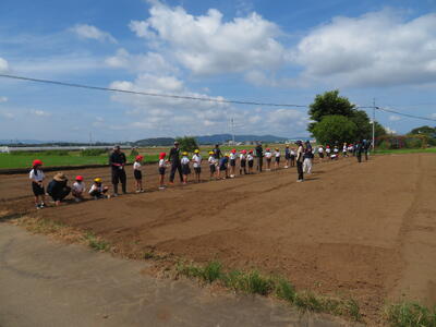 JAかしま青年部の方のご指導のもと、みんなで一列に並び、印のところに穴を掘って、一粒一粒丁寧に植えました。
