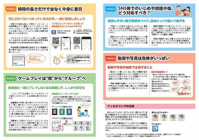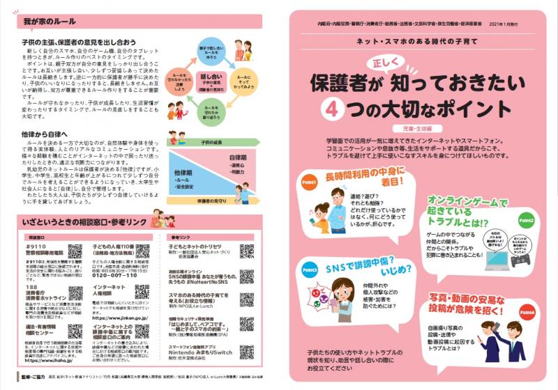 一覧へ 青少年のインターネット利用に係る保護者向け普及啓発リーフレットについて 投稿日時: 2021/02/16 学校サイト管理者 青少年のインターネット利用に係る保護者向け普及啓発リーフレットについて、お知らせします。 保護者が正しく知っておきたい4つの大切なポイント.pdf