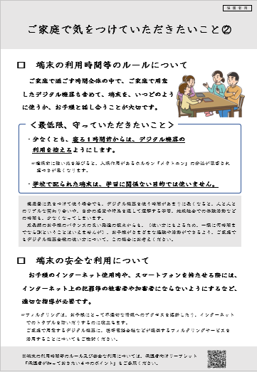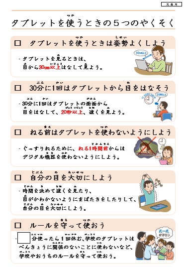 一覧へ タブレットを使うときに気を付けてほしいこと(文部科学省) 投稿日時: 2021/07/14 学校サイト管理者 タブレットを使うときの5つのやくそく(児童編:文部科学省).pdf ご家庭で気を付けていただきたいこと(保護者:文部科学省).pdf