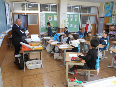 先日、河原小学校が台湾の祥和國民小學と友好提携を結んだことを受け、4年生が、12月16日(火)に地域の方をお招きして、台湾や志賀哲太郎氏についての学習をしました。クイズ形式で台湾のことを教えてもらったり、日本と台湾の歴史について触れたりしました。また、熊本の偉人である志賀哲太郎氏の功績についてわかりやすく教えていただくことができました。子どもたちは楽しく学びながら、理解を深めていました。今後は、学んだことを祥和國民小學をオンラインで交流していく予定です。