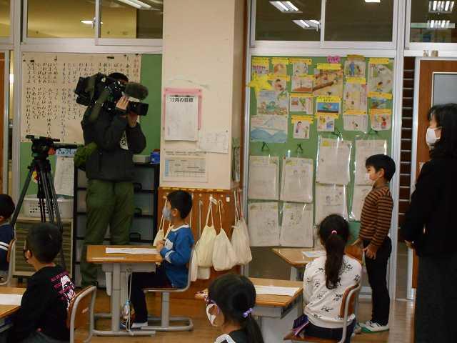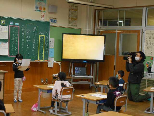 一時間目の学級活動では、冬休みの思い出発表や3学期の目標を決めました。RKKの取材もありました。