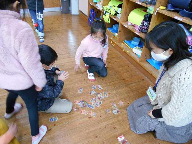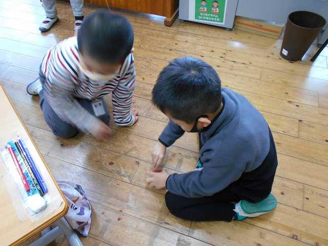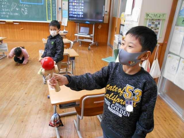 1年生の生活科の授業です。「ふゆの遊びを考えてたのしくしよう」というめあてで、子どもたちが冬の遊びを考えていました。黒板には雪合戦、雪だるま、かまくら、たこあげ、ふくわらい、はねつき・・・などが書かれていました。ちょうど教室に行ったとき、子どもたちが、けん玉やめんこなどの懐かしい遊びをしていました。