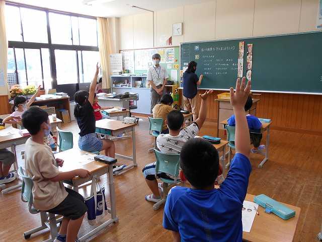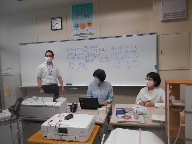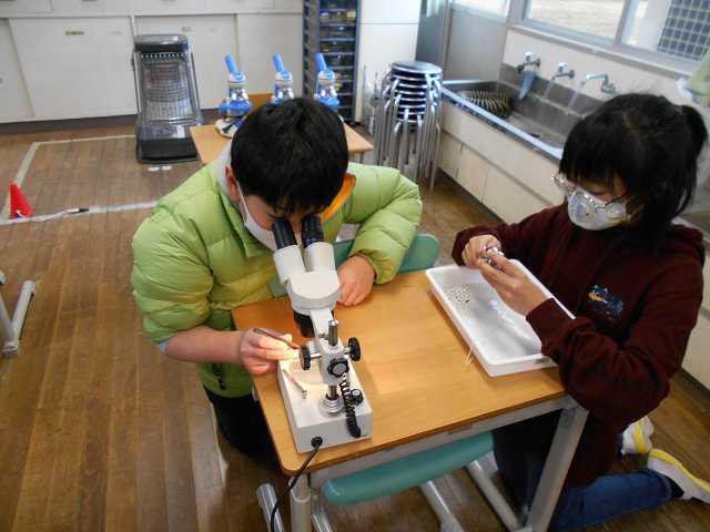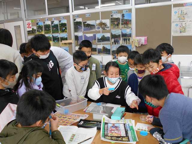 5年生が理科で「命のつながり」の学習をしています。今日は外部講師の先生と一緒にカエルのたまごの観察をしていました。学校のプールでカエルの卵を採取し、観察しました。