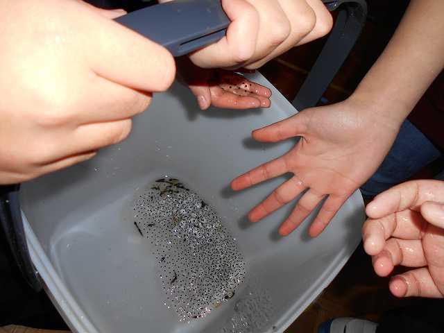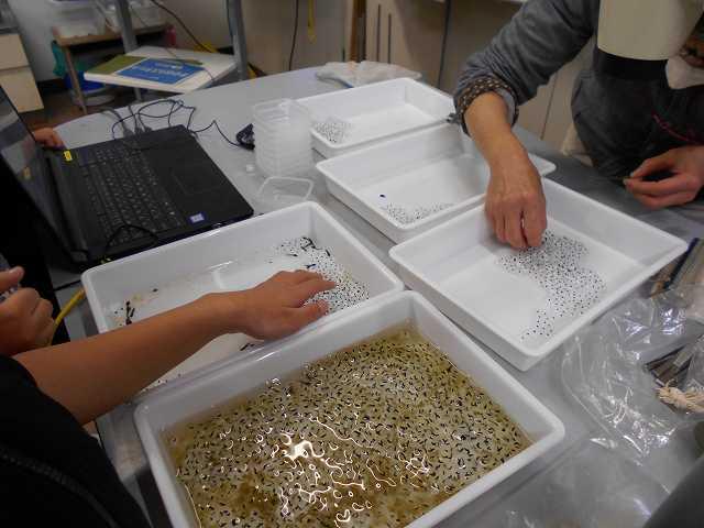 カエルは一回で何個くらいの卵を産むのかな?オタマジャクシになっているものもありましたが、結構たくさんいたようです。班にわかれてカウンターで数えました。全部で1000個以上ありました。