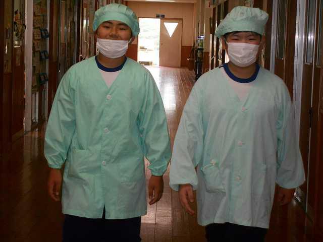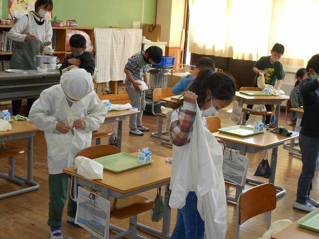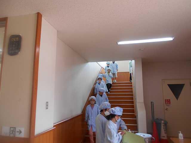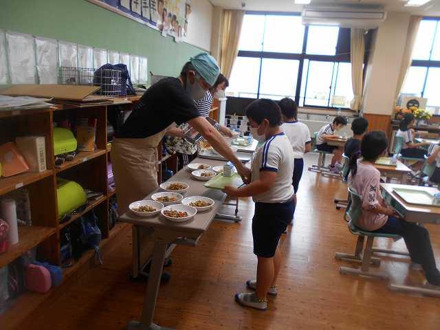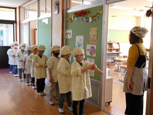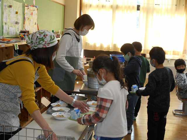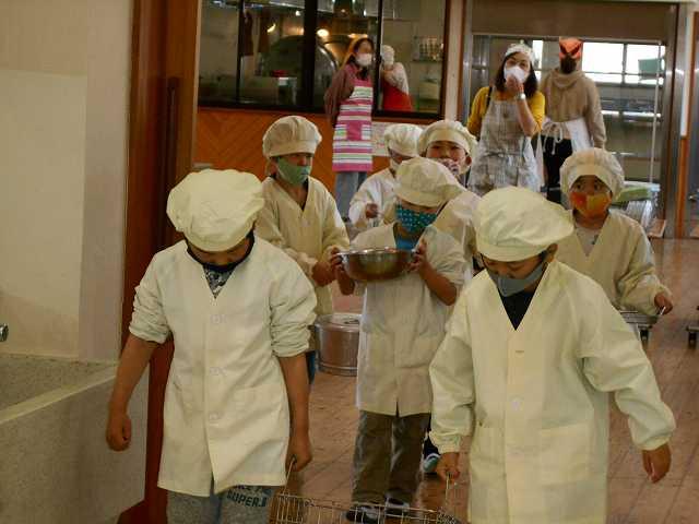 新型コロナウイルス感染拡大防止のために、本年度はランチルームでの給食をやめ、各教室で給食を食べています。さらに、1,2年生は給食準備・配膳も職員で行い、感染予防を徹底してきましたが、3月から次年度に向けて他学年と同じように自分たちで教室まで食缶や食器を運ぶようにしました。1年生は初めて給食準備を経験します。エプロンの着方やたたみ方、食缶、食器の運び方、自分の給食の取り方等、とても上手にできています。