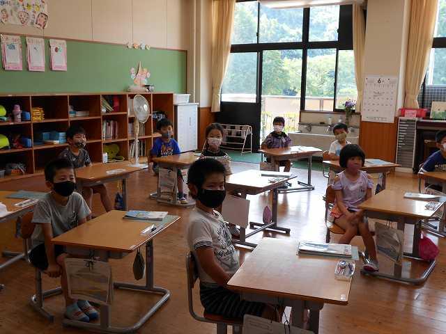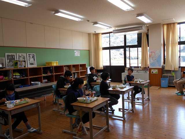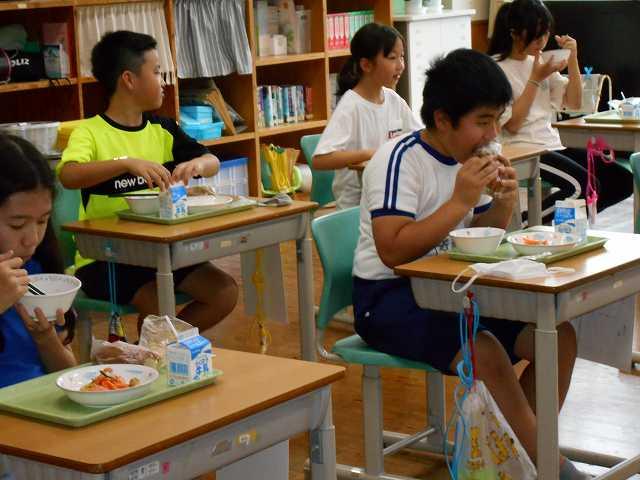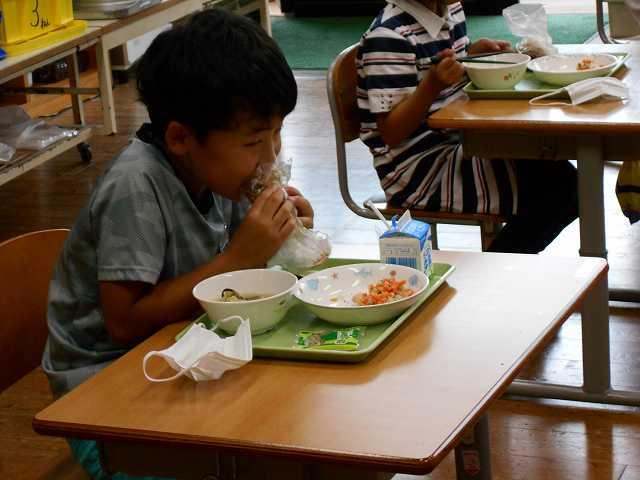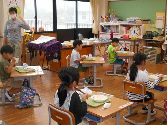 6年生と3年生です。前を向いて黙食も当たり前の光景になりました。