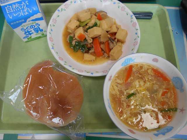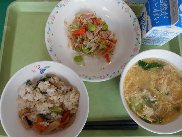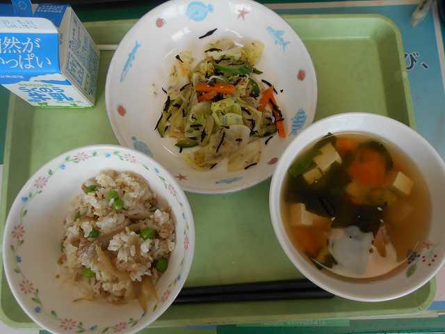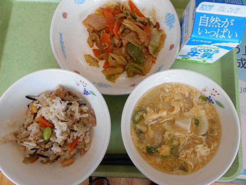 牛乳、ひじき入り五目飯、豚肉の味噌炒め、かき玉汁です