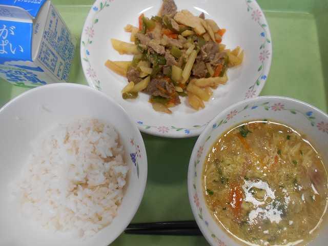 麦ご飯、牛乳、青椒肉絲、スーミータンでした。