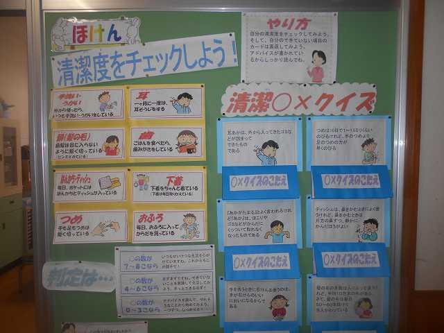 保健室前の掲示板は毎月その月に応じたトピックが掲示されています。子どもたちはよく足を止めてクイズに挑戦したり、チェックしたりしています。