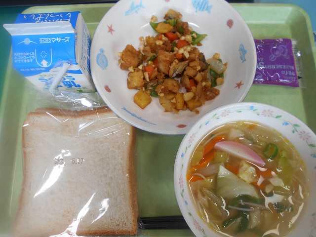 牛乳、麦ご飯、鶏の照り焼き、ゴーヤチャンプル、春雨スープです。今日は「沖縄慰霊の日」です。だから今日は沖縄の代表的料理「ゴーヤチャンプル」でした。子どもたちにも食べやすいように工夫してありました。
