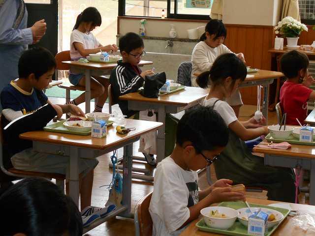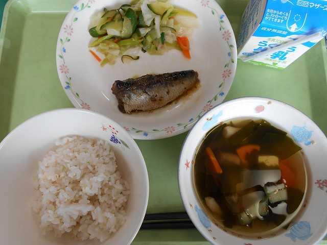 牛乳、麦ご飯、いわしのみぞれ煮、アスパラの梅和え、わかめ汁です。アスパラガスは今朝西原村で収穫されたもので、とても新鮮でした。