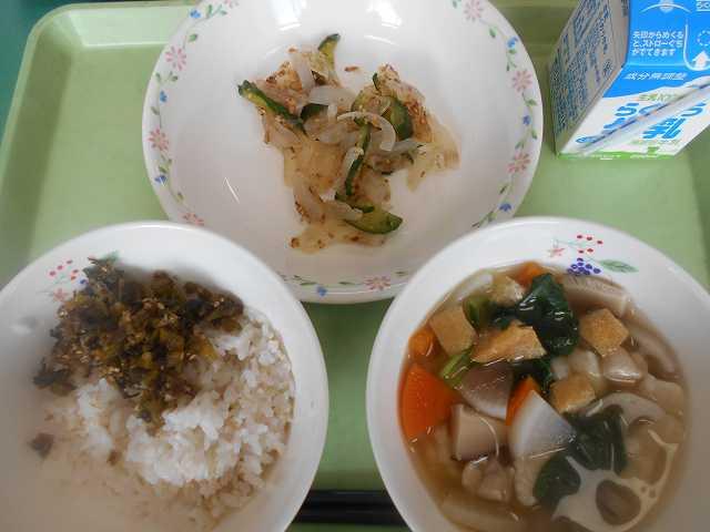 牛乳、麦ご飯、団子汁、タマネギのおかか和え、高菜の油炒めです。