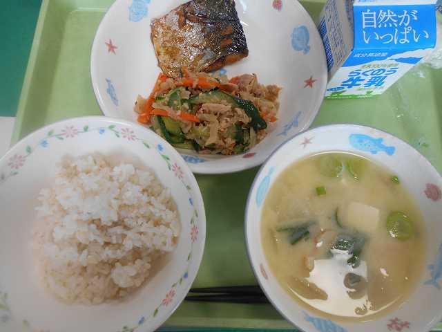 牛乳、麦ご飯、塩鮭、豚汁、ピーマンともやしの昆布和えです。